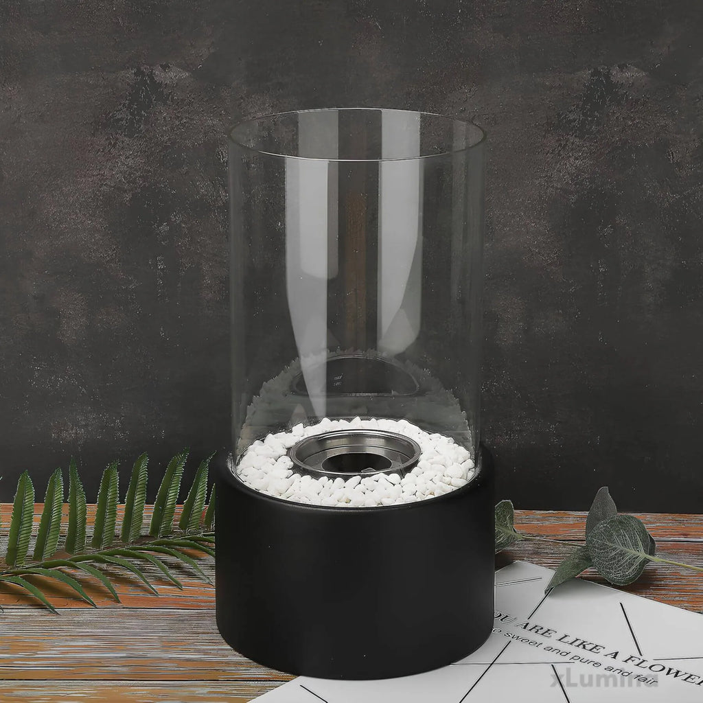 Gehäuse, Stahlsockel, Brennkammer, Glaszylinder, Feuerlöscher und Dekorationssteine.
