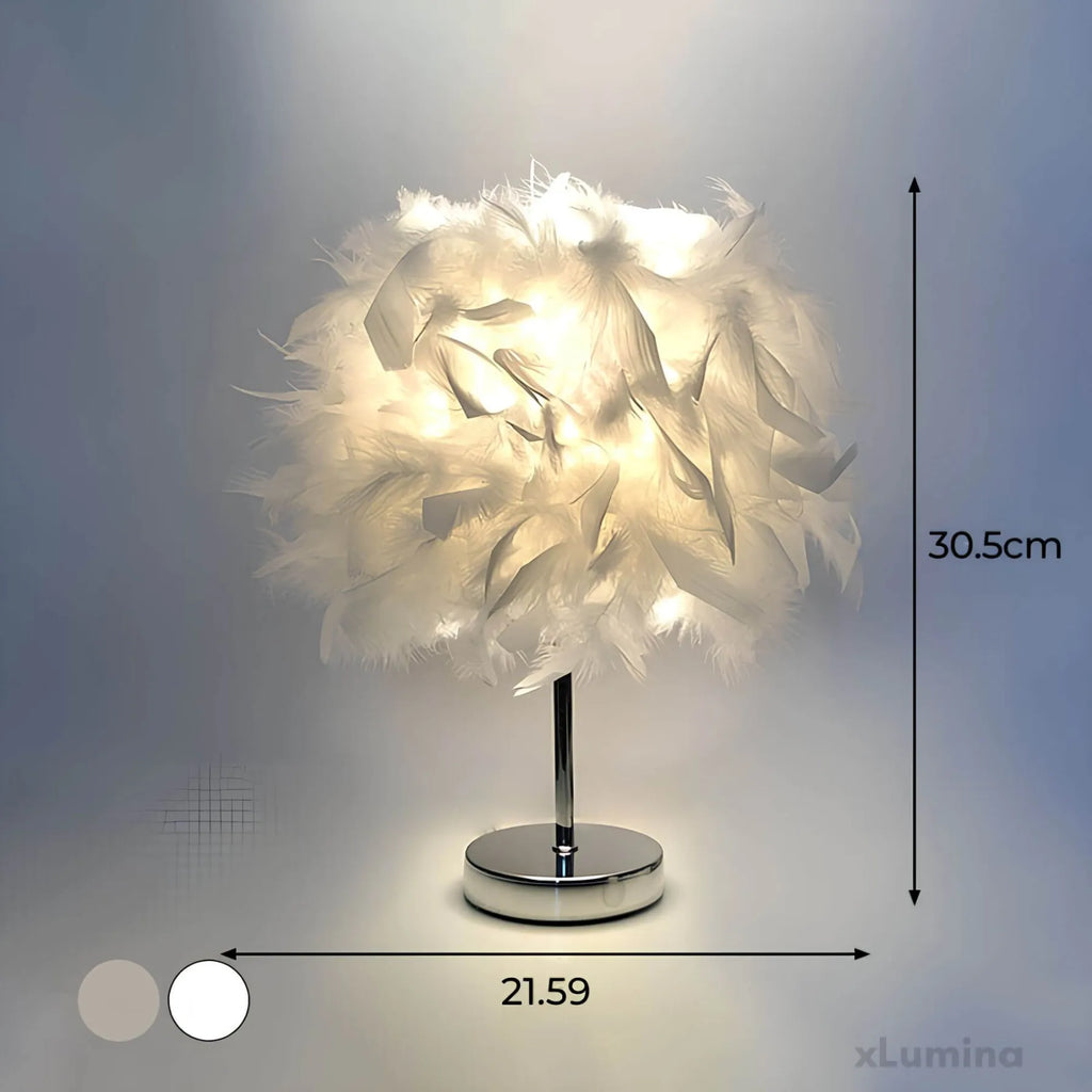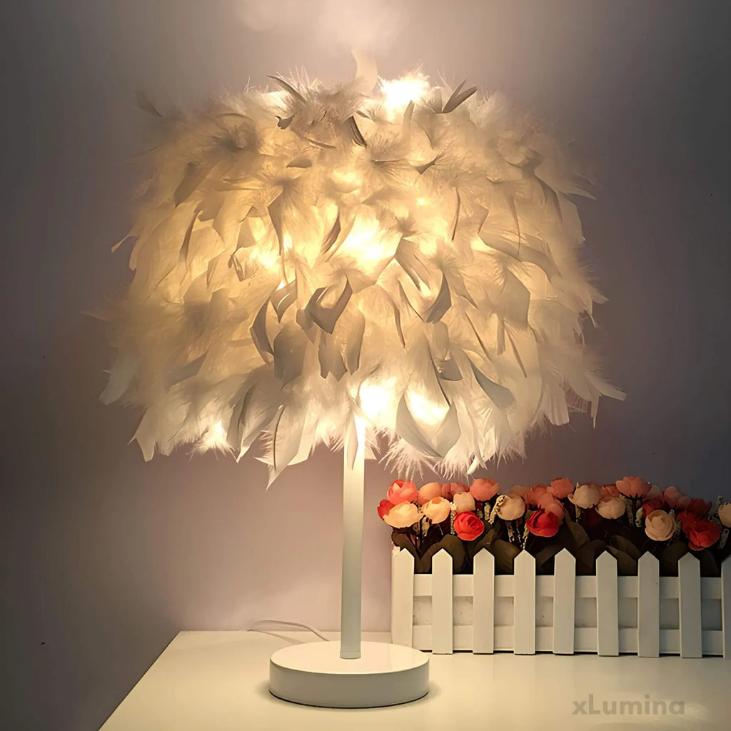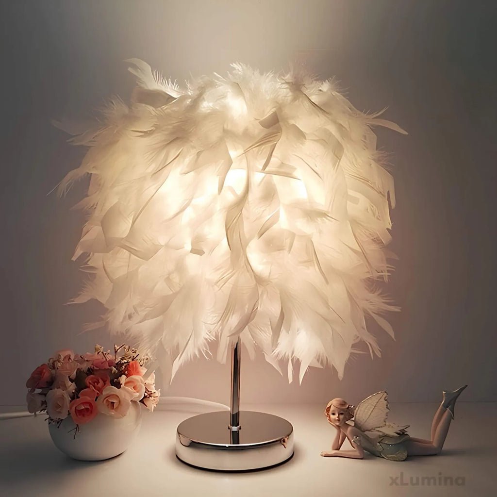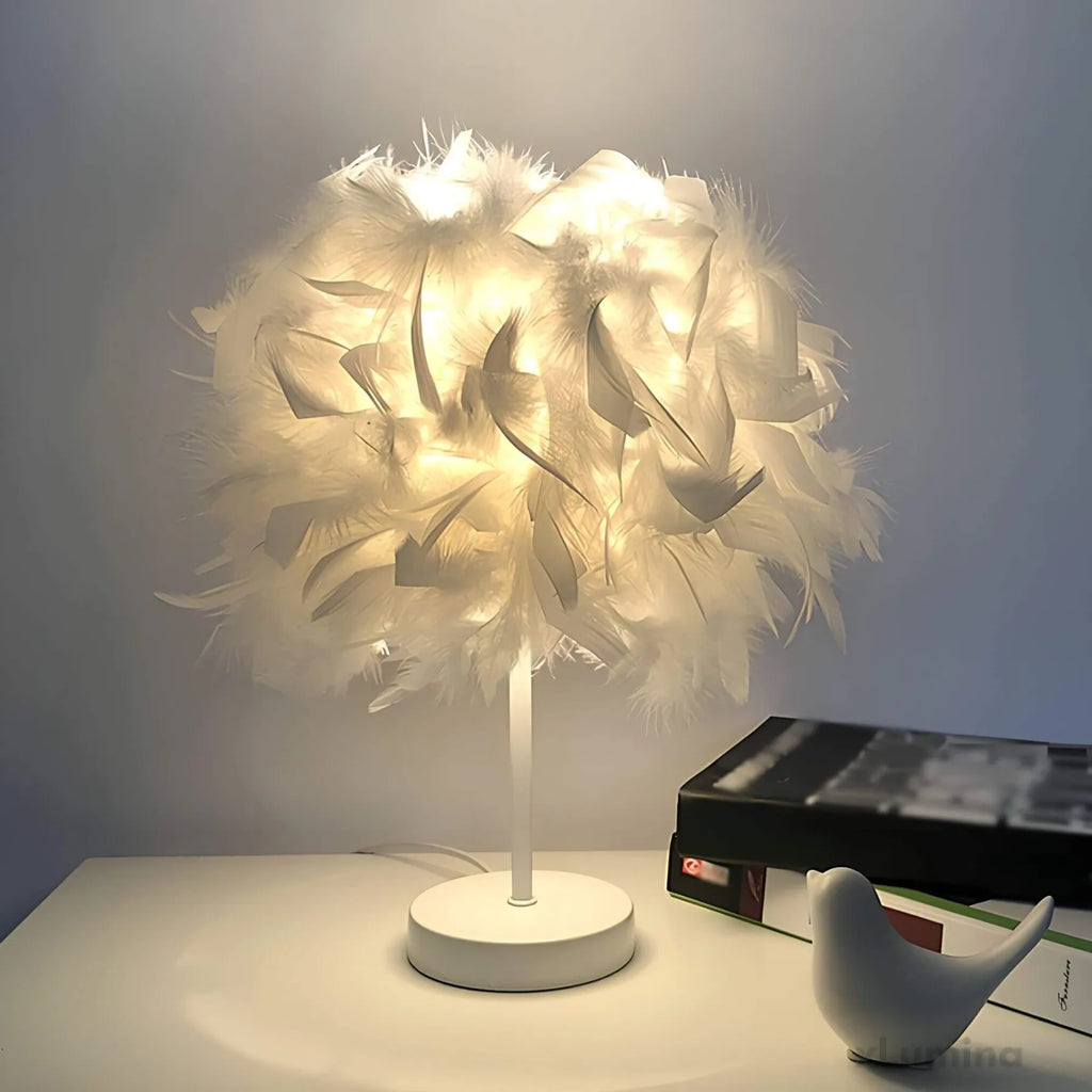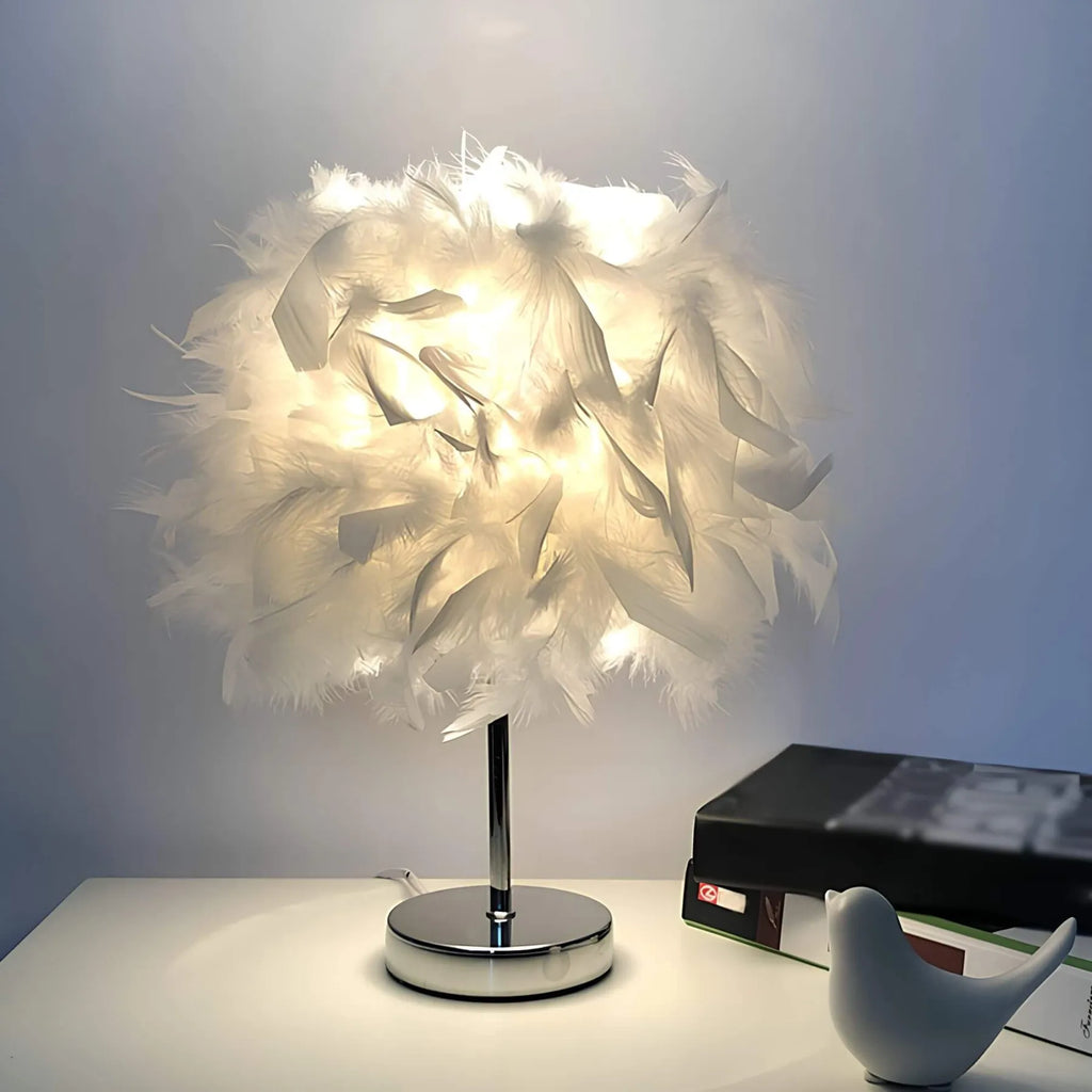 Bringen Sie mit der FederGlanz - Runde Tischlampe mit Federn einen Hauch von Eleganz in Ihre Wohnräume. Diese exquisite Lampe kombiniert ein rundes Design mit weichen Federn, die für eine warme und gemütliche Atmosphäre sorgen.