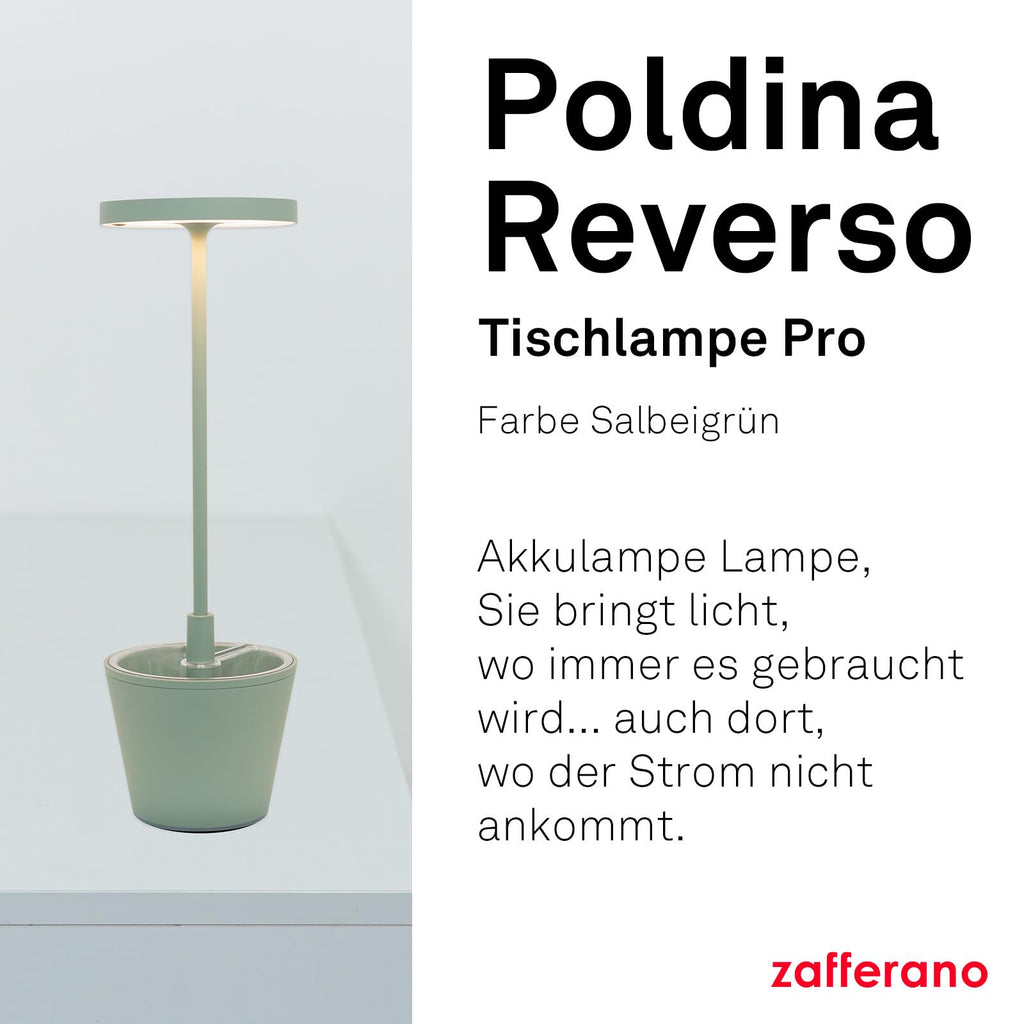 alt="Zafferano, Poldina Reverso Lampe, Wiederaufladbare und Kabellose Tischlampe mit Touch Control, Geeignet für den Innen- und Außenbereich, Dimmer, 2200-3000 K, Höhe 35 cm, Farbe Salbei">